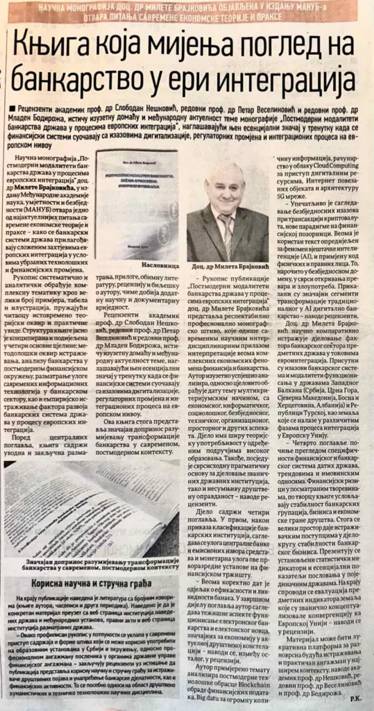 Dana 14. februara dnevne novine „DAN“ iz Podgorice, Crna Gora objavile su članak o naučnoj monografiji doc. dr Milete Brajkovića. Izdavač knjige iz 2025. godine je Međunarodna Akademija Nauka, Umetnosti i Bezbednosti – MANUB, a urednik publikacije je predsednik MANUB Akademik prof. dr Slobodan Nešković.